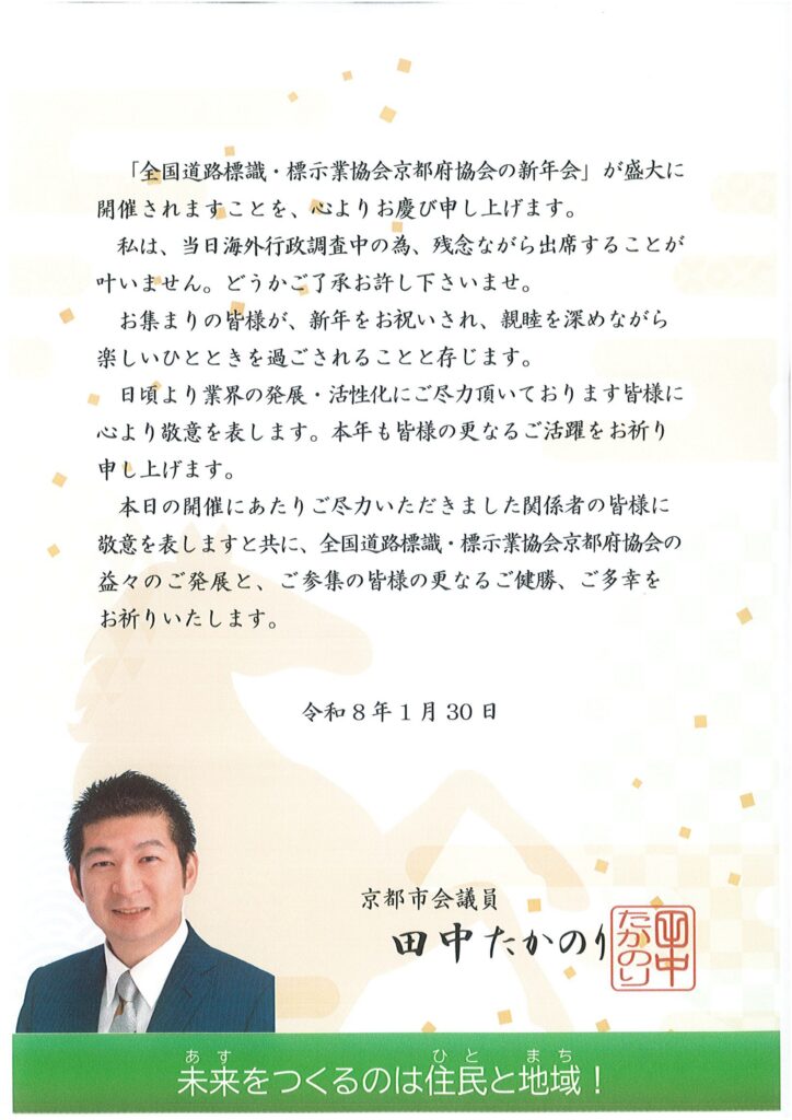 今回海外行政調査中の為ご欠席されました、京都市会議員 田中先生よりメッセージを頂戴いたしました。