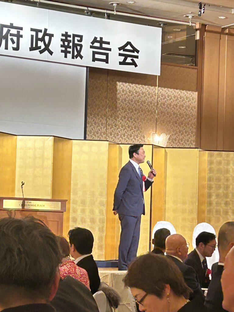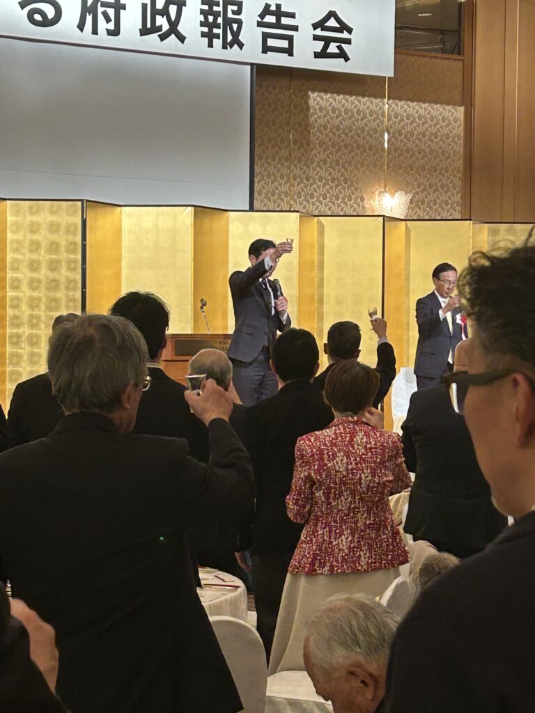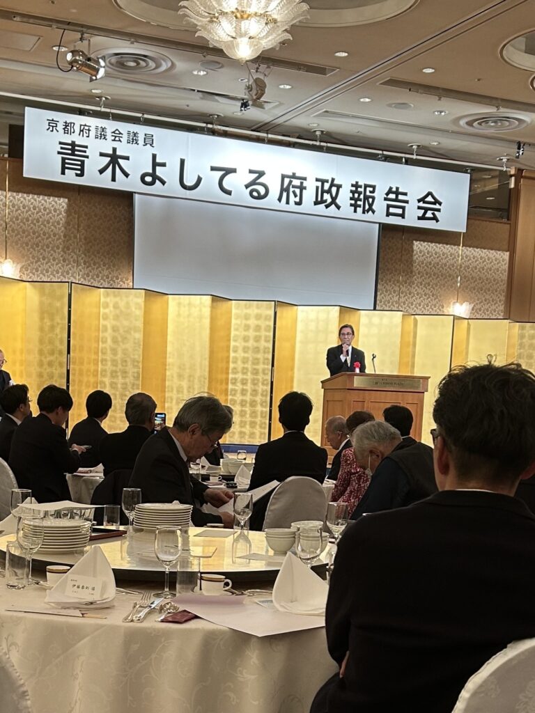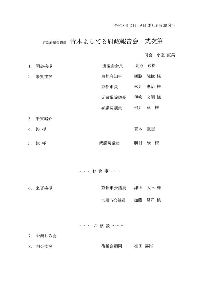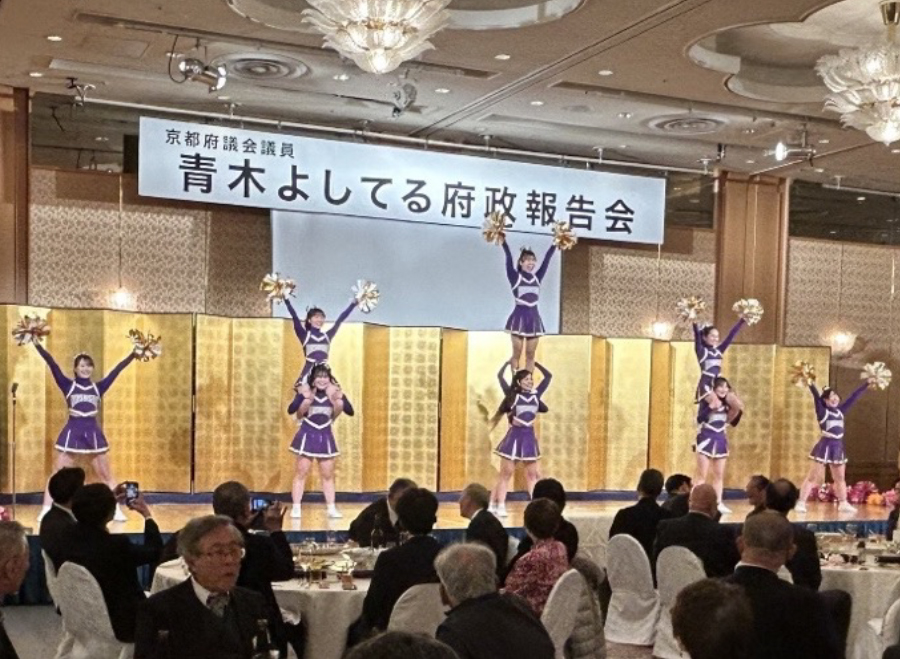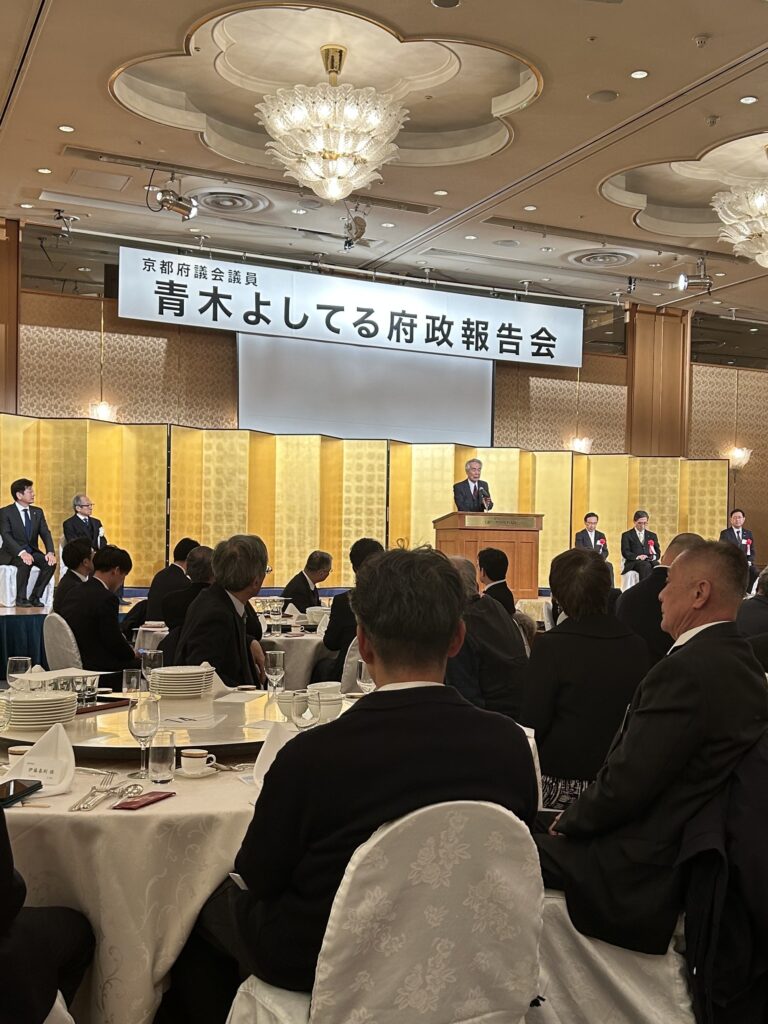 令和8年2月19日(木) ANAクラウンプラザホテル京都にて行われました。当協会顧問である、京都府議会議員 青木義照先生の府政報告会へ出席いたしました。当協会からは、役員5名が出席いたしました。 青木先生ご挨拶 西脇京都府知事ご挨拶 松井京都市長ご挨拶 元衆議院議長 伊吹様ご挨拶 衆議院議員 勝目先生 乾杯のご発声 同志社大学 チアリーダー部の皆様 西脇京都府知事との1枚 式次第 活動報告 令和7年度 新年会を行いました 関連記事 令和7年度 新年会を行いました 2026年2月2日 京都市へ表敬訪問させていただきました 2026年1月23日 京都府建設産業団体連合会 令和8年 新春年賀交歓会へ出席いたしました 2026年1月7日 京都府庁へ陳情を行いました 2025年12月12日 第24回KKW会を開催しました 2025年11月14日 『田中たかのり後援会 オータムパーティー2025』へ参加いたしました 2025年9月17日 第23回KKW会を開催しました 2025年8月29日 令和7年度の清掃ボランティアを実施しました 2025年8月25日